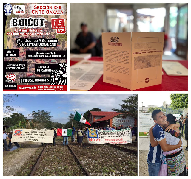 En Chiapas, los pasados 14 y 15 de noviembre se llevó a cabo la audiencia del compañero Manuel Gómez Vázquez, base de apoyo del Ejercito Zapatista de Liberación Nacional quien estuviera encarcelado desde el año 2020 en el CERSS 16 de Ocosingo, acusado de un delito que no cometió.  Ahora, tras la campaña de solidaridad por su libertad, el compañero ha sido liberado el día 16 de noviembre después de una audiencia plagada de trabas e irregularidades por parte del poder judicial. En un comunicado la Red de Resistencia y Rebeldía Ajmaq puntualiza: “Debemos aclarar que la libertad de Manuel no es una concesión del Estado mexicano, ni es prueba que el sistema de impartición de justicia funcione, muy al contrario, demuestra un Estado criminal con estructuras para reprimir, capaz de fabricar delitos”.  En Oaxaca, el pasado 15 de noviembre en el marco del primer informe del gobernador Salomón Jara, el magisterio democrático de la Sección XXII del SNTE-CNTE se movilizó para boicotear el informe. Desde temprana hora los trabajadores de la educación se concentraron en el zócalo de la Ciudad y retiraron vallas metálicas, sillas y templete para el acto oficialista en medio de consignas como ¡Gobierne quien gobierne los derechos se defienden! y ¡Sección 22, la única no hay dos! Otra comisión de maestros se trasladó a la cámara de diputados local para manifestarse ante la entrega del informe impidiendo la salida del personal y funcionarios de Estado, entre ellos el Secretario de Gobierno Jesús Romero. Finalmente, el gobierno oaxaqueño tuvo que improvisar y mandar llamar acarreados de los sindicatos charros (amarillos) y del gansteril “Frente Unido de Comunidades Oaxaqueñas” (FUCO) que lidera el ahora candidato a Senador Antonio Morales Toledo, quien a inicio del sexenio de AMLO fue investigado por la Unidad de Inteligencia Financiera en la operación “Agave Azul”. En el Istmo de Tehuantepec, la Unión de Comunidades Indígenas de la Zona Norte del Istmo (UCIZONI) dio a conocer un comunicado donde denuncia la criminalización contra 16 de sus compañeros contra quienes se ha abierto una investigación el delito de “ataques a las vías de comunicación” por su participación en actividades de protesta contra la imposición del Corredor Interoceánico; la organización afirma que dos audiencias han sido instruidas para el 17 de noviembre y el 28 de diciembre, respectivamente. Finalmente, la Corriente del Pueblo Sol Rojo (CP-Sol Rojo) continúa las actividades dentro de la Campaña de Rectificación. En la actual fase de esta se promueve el estudio de documentos como el Manifiesto del Partido Comunista y los documentos básicos de la organización entre las diferentes estructuras. Esperamos pronto contar con un informe más amplio.