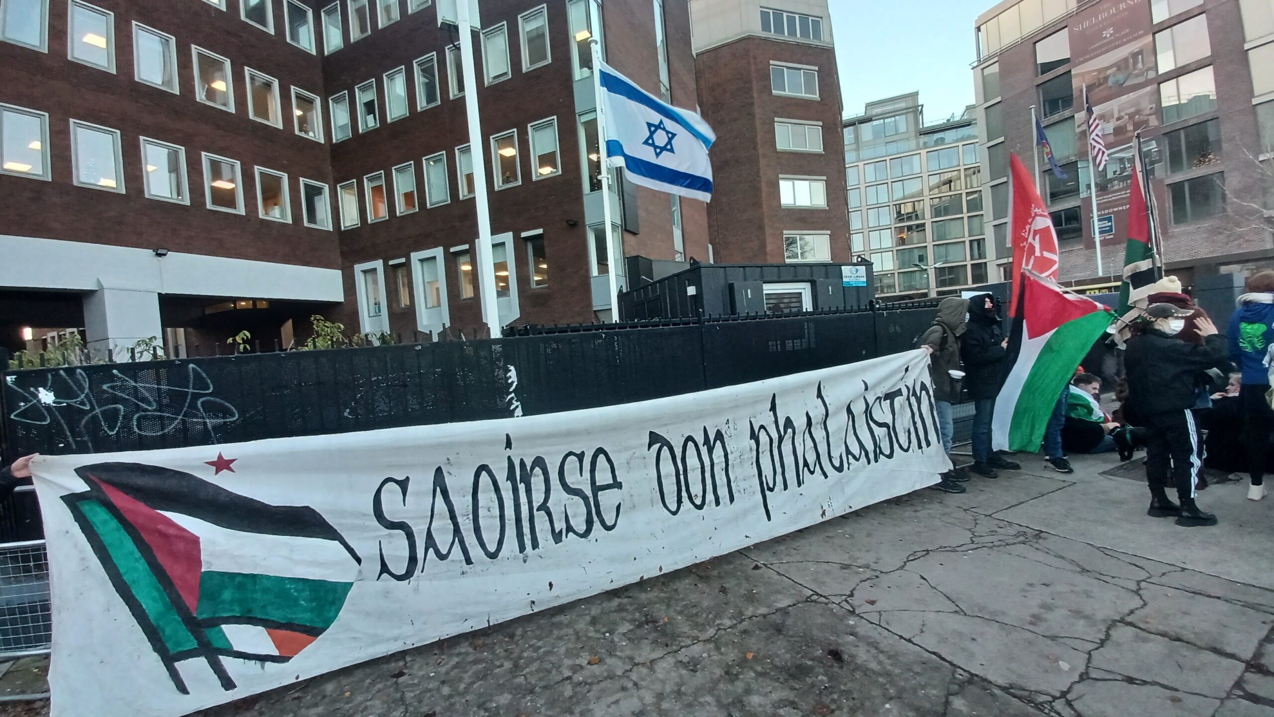 Imagen de cabecera: ocupación y bloqueo en la embajada de Israel en Dublín. Fuente: AIA