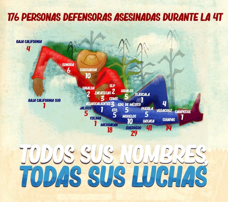 Durante todo el gobierno de AMLO diversas voces de la izquierda de abajo (ósea, la de a de veras) han denunciado que la violencia reaccionaria contra los pueblos originarios y las comunidades rurales sigue creciendo. Un informe del micrositio Alas y Raíces de la organización EDUCA menciona que hasta diciembre de 2023 se registraron… “200 atentados a la vida contra personas defensoras, dichas agresiones incluyen: desapariciones, homicidios y ejecuciones extrajudiciales, y concuerdan con el sexenio de Andrés Manuel López Obrador. En este escenario, 176 personas defensoras fueron asesinadas, 20 personas defensoras permanecen en calidad de desaparecidas y 4 aparecieron con vida”. En el informe se encuentran documentados los asesinatos de Luis Armando Fuentes Aquino, Jesús Manuel García Martínez y Félix Vicente Cruz, todos ellos integrantes de la Corriente del Pueblo Sol Rojo en el Istmo de Tehuantepec donde los pueblos se oponen firmemente a la imposición del Corredor Interoceánico.