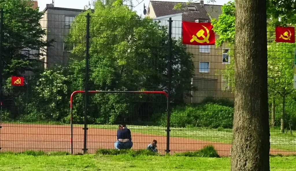 En el Oeste activistas de la Liga Roja participaron con un fuerte destacamento en la Manifestación revolucionaria del 1º de Mayo en Colonia. A pesar de la frecuencia con que la policía paraba la manifestación debido a excusas como los fuegos artificiales o supuestas máscaras de los asistentes, la protesta no se dejó intimidar. Marchó hasta que anunció su disolución bajo su propio acuerdo – sólo para realizar una retirada ordenada que tomó la forma de otra manifestación no anunciada. Vale la pena mencionar que en Renania del Norte-Westfalia también hubo actividades de los compañeros en la llamada “Vorabenddemonstration” (Nota del traductor: un concepto alemán muy extraño, muy popular entre las fuerzas “autónomas”, que en lugar de hacer la manifestación el día que se debería, se hace la noche anterior) en Bochum. Allí junto a diferentes fuerzas del movimiento revolucionario, se hizo una fuerte línea de demarcación contra los llamados “Antideutsche”. Se izaron banderas en Bochum, Duisburgo, Essen, Colonia y Wuppertal.