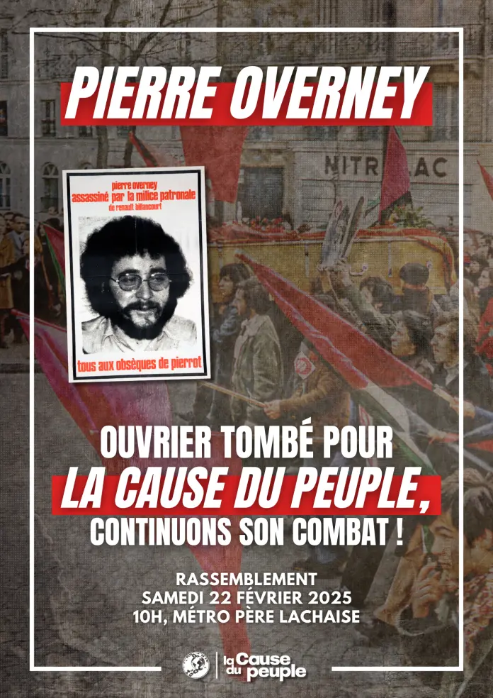 Como todos los años, nuestro periódico llama a sus lectores, a todos aquellos que simpatizan con la Causa Popular y militantes revolucionarios, a participar en el Homenaje a nuestro Camarada Pierre Overney, con motivo del 53º aniversario de su muerte.