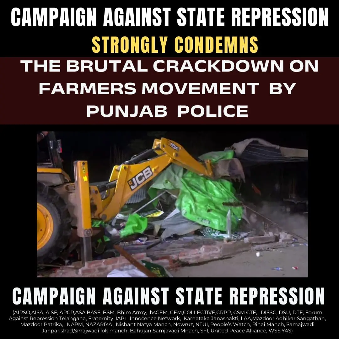 Esta cobarde represión del movimiento campesino por parte del gobierno del estado de Punjab muestra la verdadera cara del AAP. El uso de excavadoras para demoler el lugar de protesta donde los campesinos se refugiaban temporalmente durante el movimiento campesino del año pasado demuestra claramente que los gobiernos no pertenecientes al BJP están en la misma línea para reprimir los movimientos populares. Este acto de destrucción y vandalización del lugar de protesta de los campesinos plantea la cuestión de que el derecho mínimo a la protesta también es inaceptable y será brutalmente reprimido por los gobiernos.
