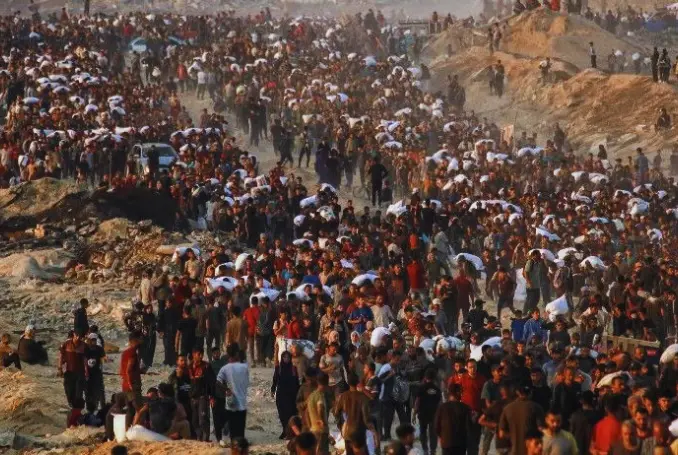 Imagen de cabecera: masas de civiles esperando a recibir alimentos Fuente: Palestine Chronicle