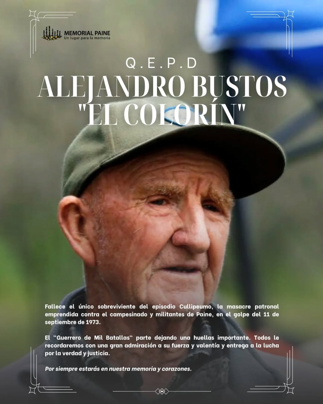 A continuación compartimos un poema a Alejandro Bustos “El Colorín”, el último superviviente de la masacre de Cullipeumo, una masacre de la patronal emprendida contra el campesinado y militantes de Paime durante el golpe de Estado del 11 de septiembre de 1973. El poema se encontró en Periódico El Pueblo Chile.