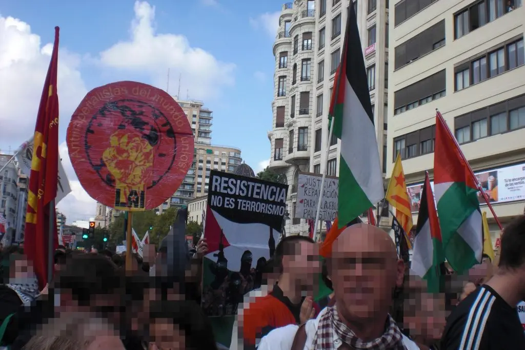 Imagen de cabecera: miles se movilizan en València. En la manifestación se ve un logo de la Liga Antiimperialista (LAI).