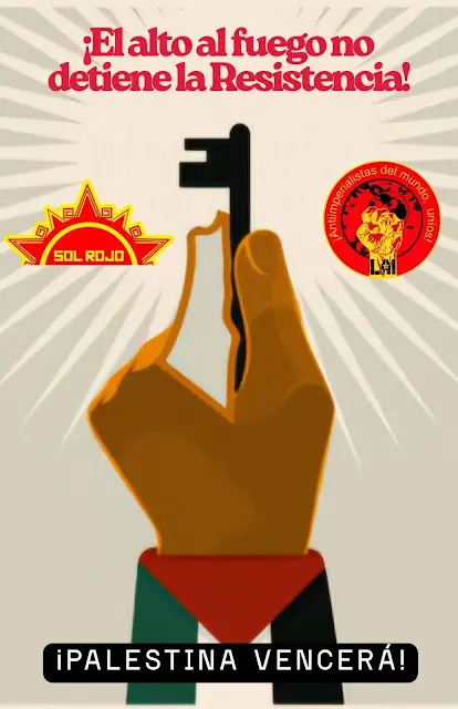 En torno a lo anterior, la Corriente del Pueblo Sol Rojo y el Comité Promotor de la Liga Anti-imperialista (Mx) llamamos a nuestra militancia, simpatizantes y aliados a desplegar una nueva campaña de solidaridad con la Resistencia Palestina, desde este día hasta finales del mes de octubre, la cual debe servir para mantener la vigilancia sobre la entidad sionista para el cumplimiento del alto al fuego, reforzando la solidaridad con el pueblo palestino y su heroica Resistencia Nacional.