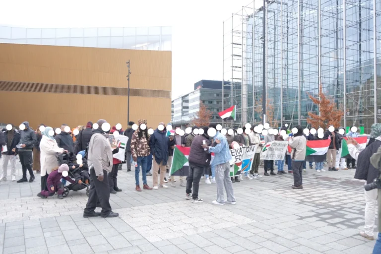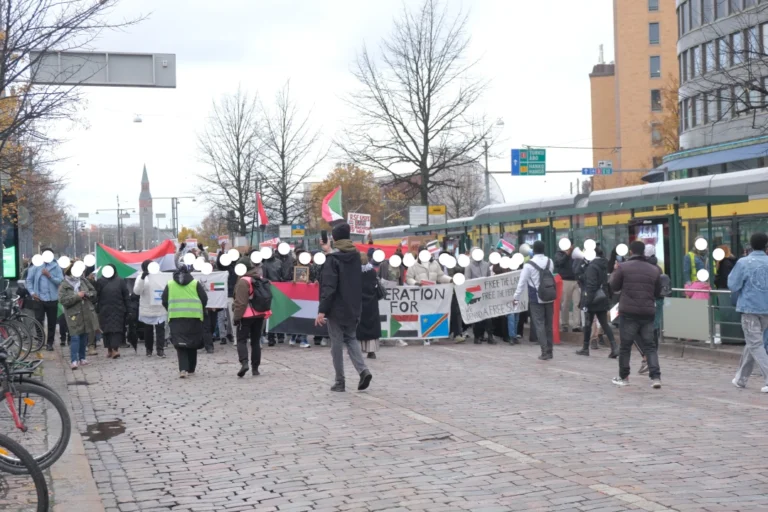 El 1 de noviembre se organizó una manifestación de solidaridad con Sudán bajo los lemas “Paz para Sudán” y “Fin al genocidio en El Fasher”. Esta manifestación, que contó con aproximadamente 100 participantes, consistió en una marcha desde Kansalaistori hasta la Embajada de los Emiratos Árabes Unidos. El ambiente entre los participantes era de entusiasmo y energía. Algunos de los cánticos fueron: “¡Libertad para el pueblo, liberar la tierra! ¡Exigimos un Sudán libre!” y “¡De Palestina a Sudán: no a la paz en tierras robadas!”. En general, los participantes comprendían la conexión entre la situación en Palestina y la de Sudán. Se escucharon discursos en finlandés, inglés y árabe. En definitiva, la manifestación fue impresionante y contundente.