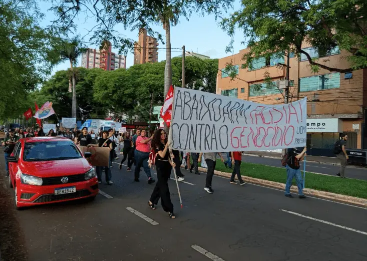Imagen de cabecera: manifestación en Maringá con una pancarta que denuncia el genocidio al frente de la movilización.