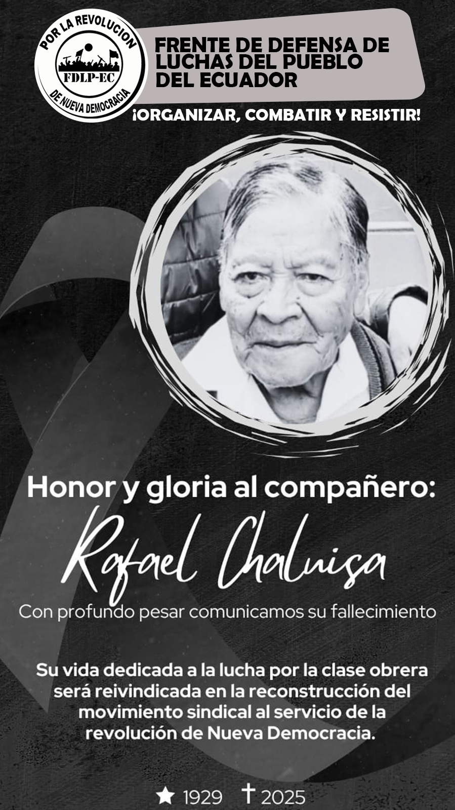 El Frente de Defensa de las Luchas del Pueblo del Ecuador, ante el sensible fallecimiento del compañero Rafael Chaluisa S., expresa a sus familiares y compañeros nuestra más profunda solidaridad clasista.