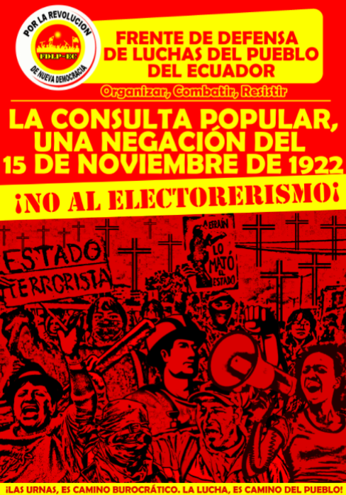 El FDLP-EC llamó a no votar y a no participar en la consulta popular porque ideológica y políticamente es lo correcto. Independientemente de los resultados, los grandes burgueses y los grandes terratenientes seguirán haciendo lo que consideren oportuno, esté o no escrito en la Constitución. Hay que entenderlo: detrás del gobierno, de la llamada democracia burguesa-terrateniente y de las elecciones, se sostiene una dictadura de clase que hará hasta lo inimaginable por mantener el poder en sus manos.