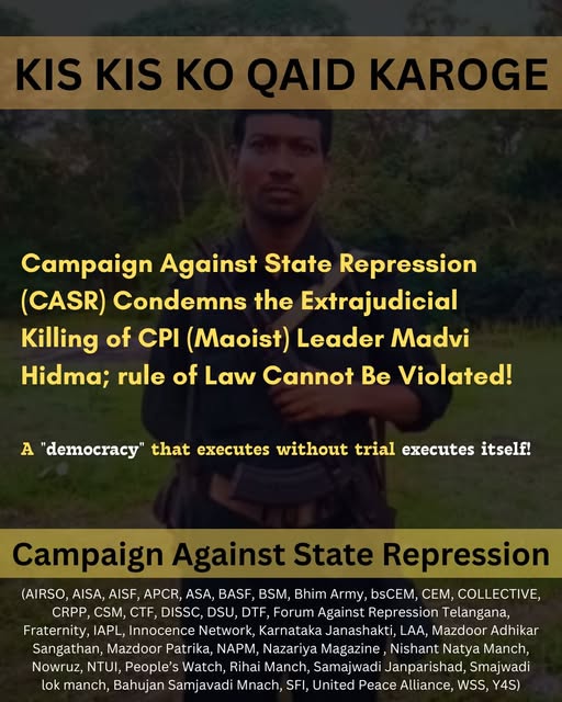 La Campaña Contra la Represión Estatal (CASR) condena el asesinato extrajudicial del líder del PCI (Maoísta) Madvi Hidma; No se puede suspender el Estado de Derecho en Bastar