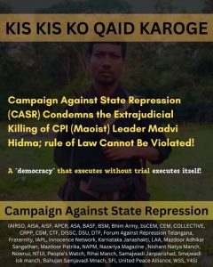 El 18 de noviembre, Madvi Hidma, miembro del Comité Central del Partido Comunista de India (Maoísta), y Secretario del Comité Especial Zonal de Dandakaranya (DSKZ), adivasi originario de Bastar, fue asesinado junto con su camarada y esposa Rajakka, y otros cinco camaradas en un falso encuentro, como han denunciado numerosas organizaciones, entre ellas Campaña Contra la Represión Estatal (CASR).