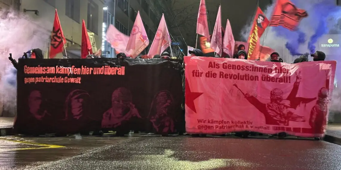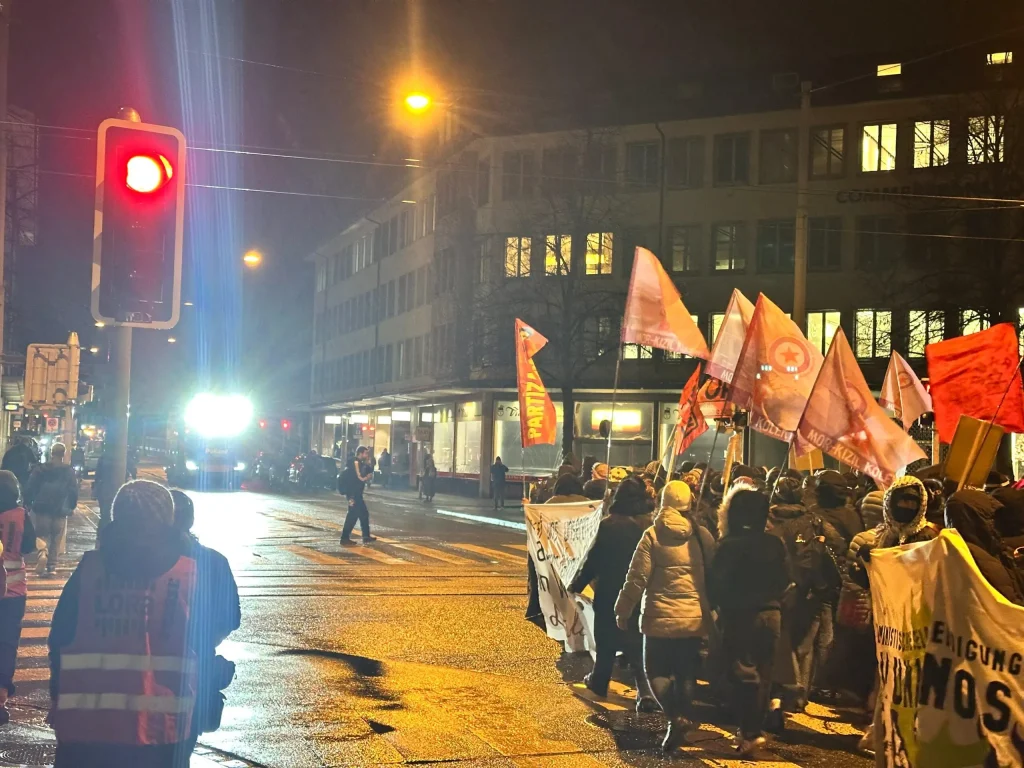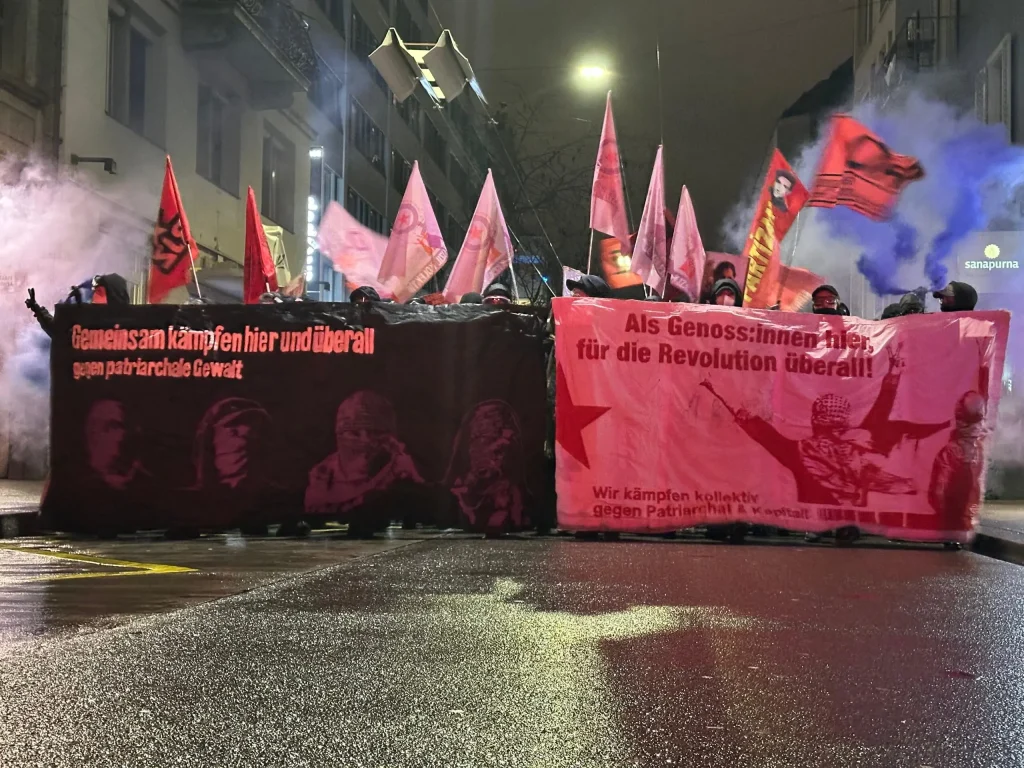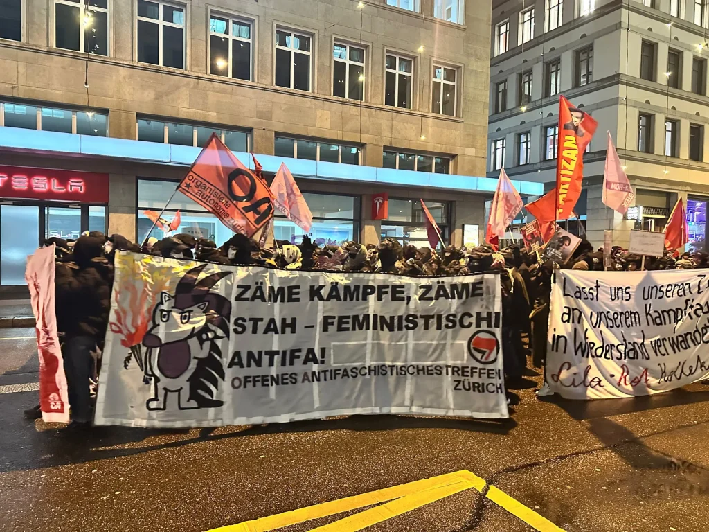 La multitud, marchando desde Bahnhofstrasse hasta Helvetiaplatz, coreaba frecuentemente consignas como «Jin, Jiyan, Azadi», «A-anti-anticapitalista», «Libertad, libertad Palestina», «Ni una menos», «Sí significa sí y no significa no», «Alerta alerta anti-sexista» y «Siamo Tutti Antifascisti». Entre las organizaciones participantes estaban el Colectivo Púrpura-Rojo, SKB, ADKH y Mujeres de Nueva Democracia.