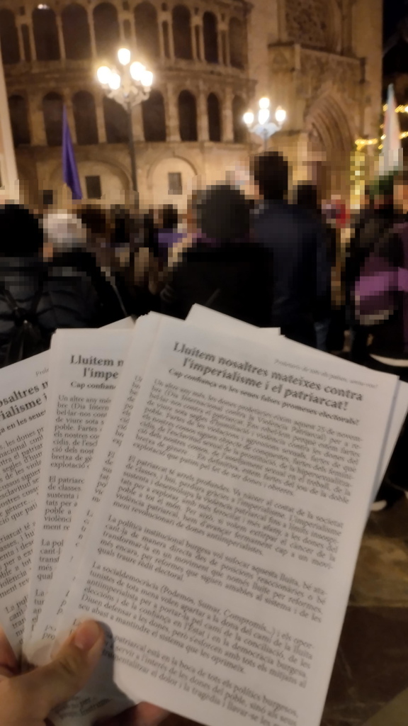 En Valencia, el Comité Revolucionario hizo una pinta y se repartieron volantes durante la manifestación. En el volante se denunció la relación entre el patriarcado y el imperialismo además de la farsa electoral y el papel de la socialdemocracia y los oportunistas para que la mujer no tome el camino de la lucha antiimperialista.