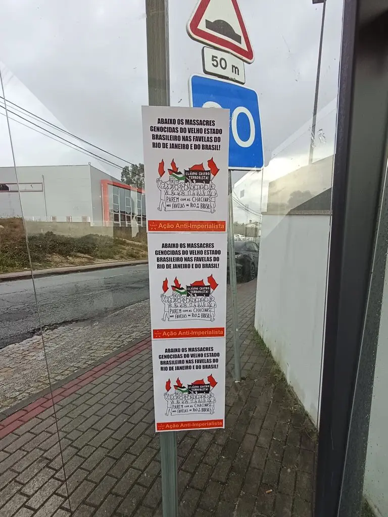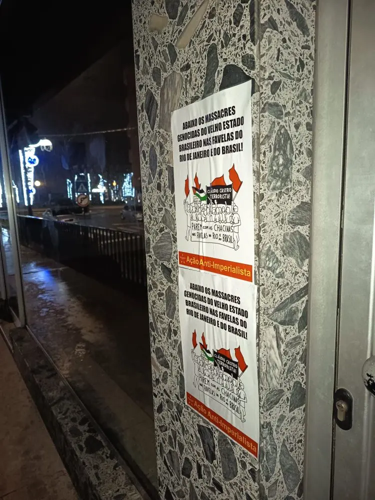 También se han pegado carteles contra la enorme masacre llevada a cabo por el viejo Estado brasileño contra el pueblo en Rio de Janeiro.