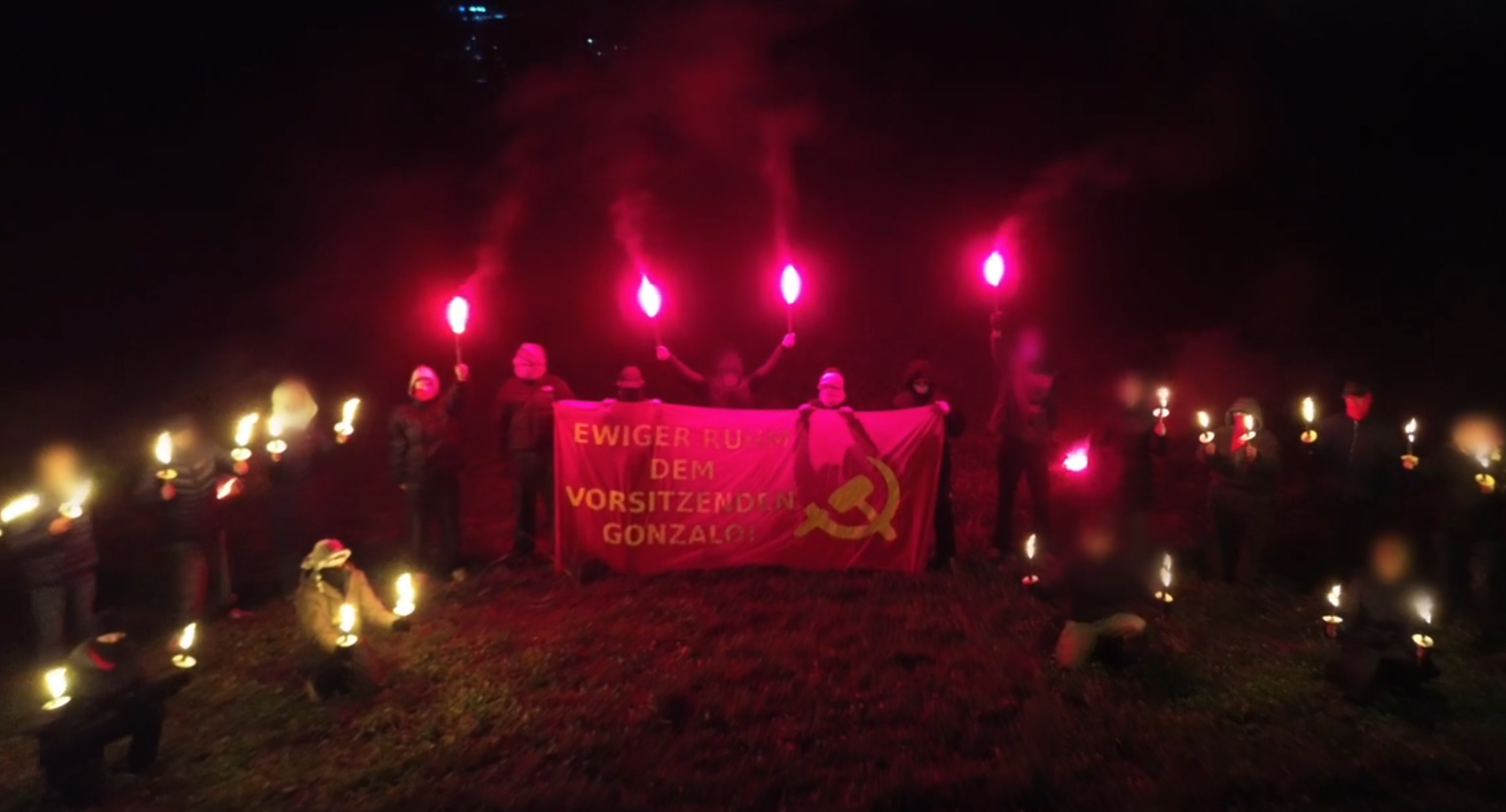 Imagen de cabecera: activistas de la Liga Roja de Alemania conmemorando el aniversario del natalicio del Presidente Gonzalo y la fundación del EPL con una coreografía con antorchas.