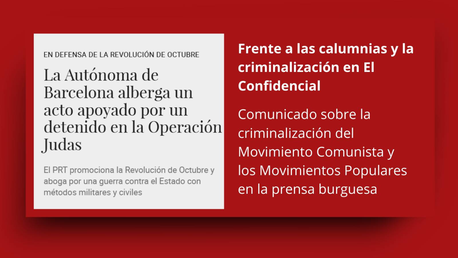 El 15 de noviembre de este año 2025 se publica en el periódico El Confidencial un artículo en el que, con la excusa de la charla sobre la Revolución de Octubre que realizamos el 13 de noviembre en la Universitat Autònoma de Barcelona, se insinúa la vinculación del PRT con acciones terroristas, como un “partido radical y extremista”. El artículo está escrito por un periodista, por llamarlo de alguna manera, cuyos artículos se basan en una continua denuncia y ataque al movimiento independentista catalán así como a colectivos de izquierda.