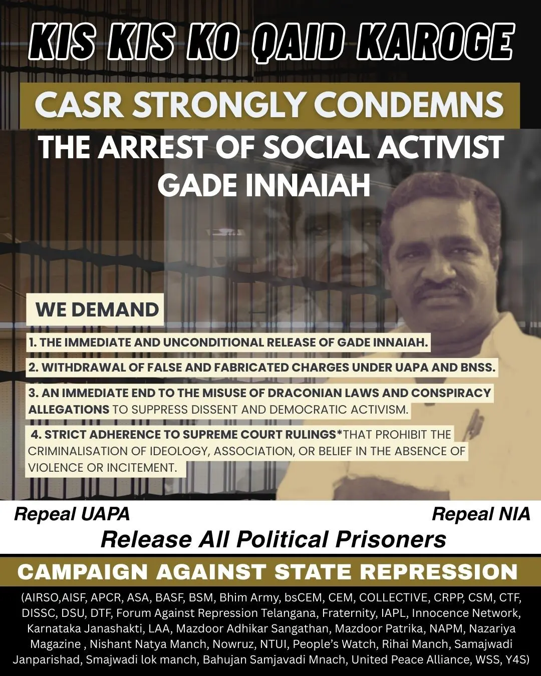 La Campaña contra la Represión Estatal (CASR) condena de manera inequívoca el arresto del conocido activista social Gade Innaiah, que representa un nuevo ejemplo del ataque sistemático del Estado contra los derechos democráticos, las libertades civiles y la disidencia política.