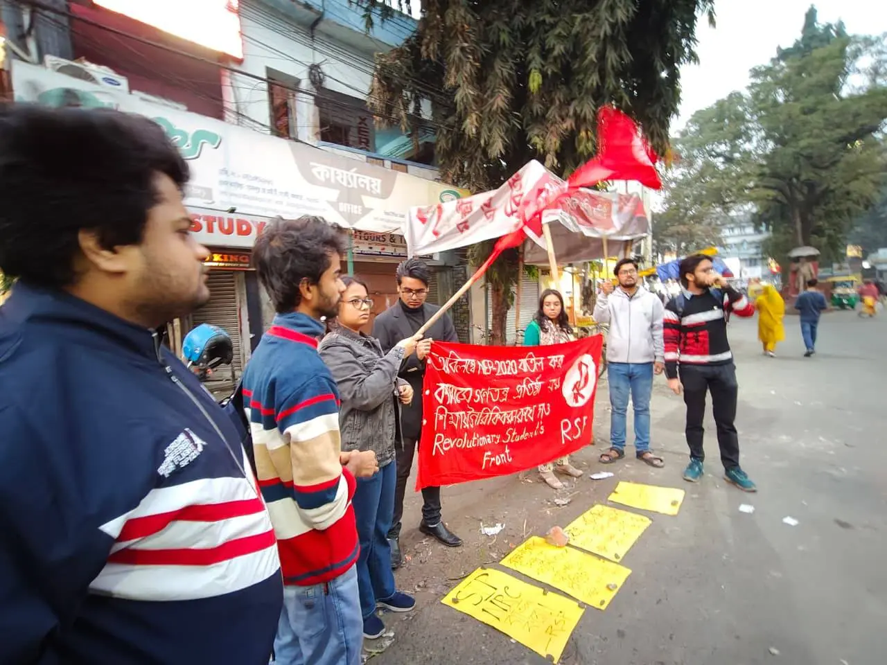 El 25 de diciembre, el Frente de Estudiantes Revolucionarios (RSF) organizó una concentración en la calle en Jadavpur 8B, llamando a quemar la memoria de Manusmriti [Nota del traductor: leyes fundamentales del hinduísmo] en el fuego rojo de Naxalbari, contra la agresión fascista brahmánica Hindutva en la India y el continuo asesinato de minorías, dalits e indígenas por parte del fascismo en todo el país, y contra la implementación del NRC [Nota del traductor: Registro Nacional de Ciudadanos, un censo presentado por el viejo Estado indio que podría dejar a grupos sociales y religiosos sin derechos] en nombre de la SIR [Nota del traductor: Revisión Intensiva Especial es un ejercicio de verificación a gran escala para llevar a cabo un mayor control de la población india].