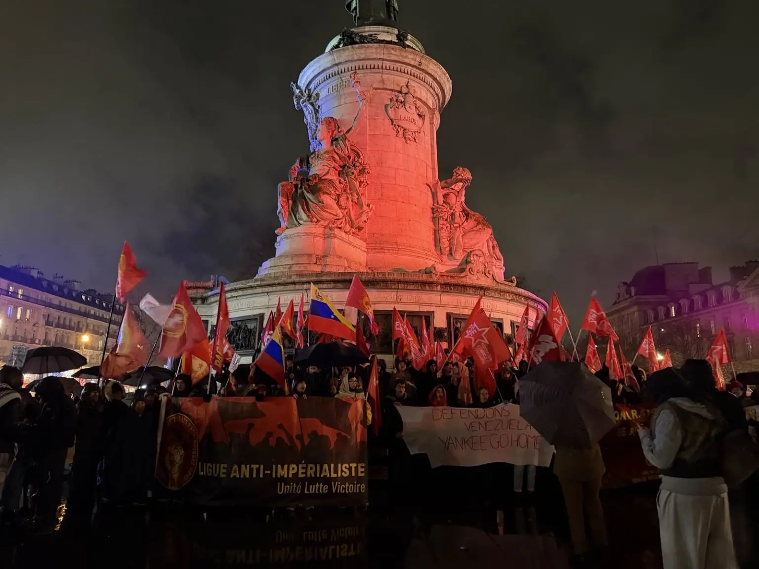 Se vieron banderas de la Liga Antiimperialista (LAI), recordando la próxima conferencia de lanzamiento de la sección francesa de la organización, programada para el 28 de febrero en París. El éxito de esta manifestación, organizada antes del ataque del 3 de enero y celebrada en la víspera de nuevas movilizaciones ampliamente difundidas, muestra que se ha dado un paso adicional hacia la unión de las fuerzas vivas del campo antiimperialista y revolucionario en el país.