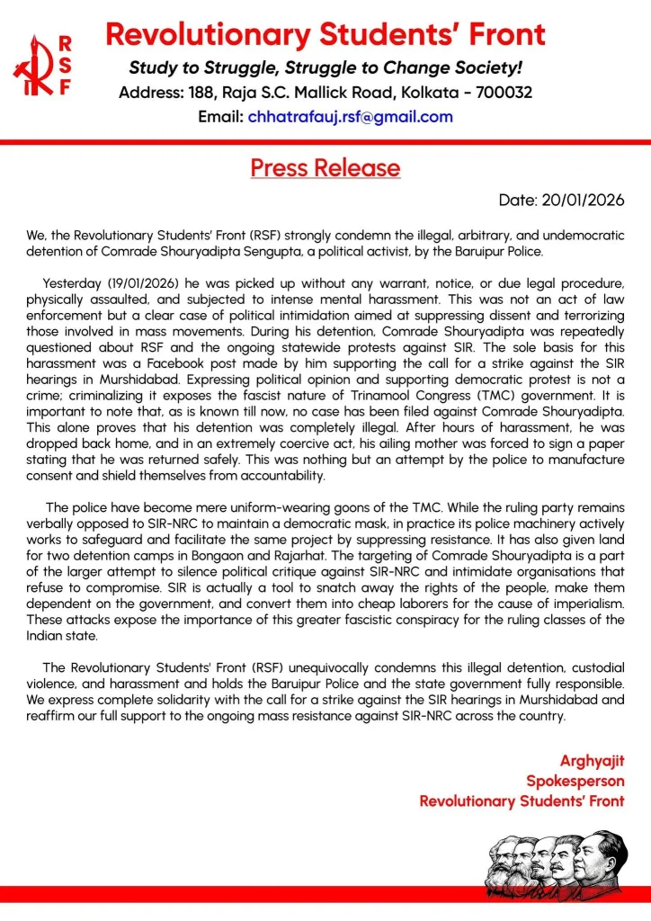 Ayer (19/01/2026) fue detenido sin orden judicial, notificación ni debido procedimiento legal, agredido físicamente y sometido a intenso acoso psicológico. Esto no fue un acto de las fuerzas del orden, sino un claro caso de intimidación política destinada a reprimir la disidencia y aterrorizar a quienes participan en movimientos de masas. Durante su detención, el compañero Shouryadipta fue interrogado repetidamente sobre RSF y las protestas estatales en curso contra la SIR [Nota del traductor: Revisión Intensiva Especial es un ejercicio de verificación a gran escala para llevar a cabo un mayor control de la población india]. La única base de este acoso fue una publicación de Facebook que hizo apoyando el llamamiento a la huelga contra las audiencias de la SIR en Murshidabad. Expresar opiniones políticas y apoyar la protesta democrática no es un delito; criminalizarlo expone la naturaleza fascista del gobierno del Congreso Trinamool (TMC). Es importante señalar que, como se sabe hasta ahora, no se ha presentado ninguna denuncia contra el compañero Shouryadipta. Esto por sí solo demuestra que su detención fue completamente ilegal. Tras horas de acoso, lo llevaron de vuelta a casa y, en un acto extremadamente coercitivo, obligaron a su madre enferma a firmar un documento que declaraba que había regresado sano y salvo. Esto no fue más que un intento de la policía de manipular el consentimiento y eludir la responsabilidad.