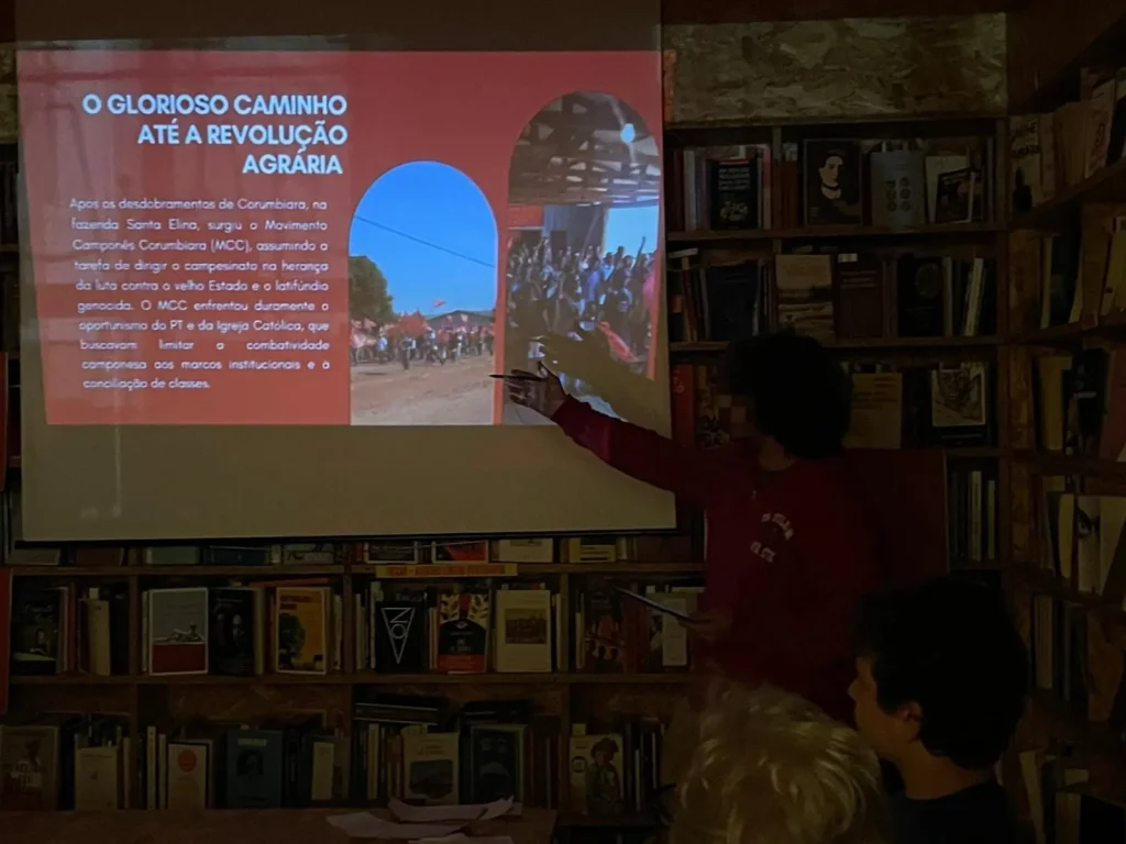 Se comenzó hablando de la raíz histórica de la cuestión agraria, con el surgimiento de latifundios heredados del colonialismo portugués, y se continuó destacando la historia de la resistencia campesina en Brasil, desde las primeras revueltas al desarrollo del movimiento comunista organizado. Se rindió tributo al revolucionario lisbo-brasileño Alípio de Freitas, fallecido en 2017, quien dedicó gran parte de su vida en Brasil para avanzar con la lucha contra el latifundio.