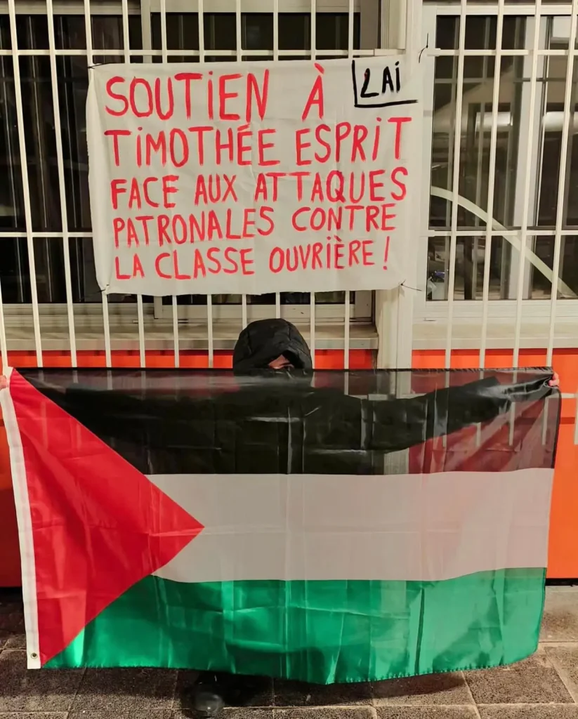 Timothée Esprit es un trabajador revolucionario y miembro del sindicato CGT-FNIC. Durante años, ha liderado numerosas luchas en su fábrica. Al mismo tiempo, es un fiel defensor del pueblo palestino.