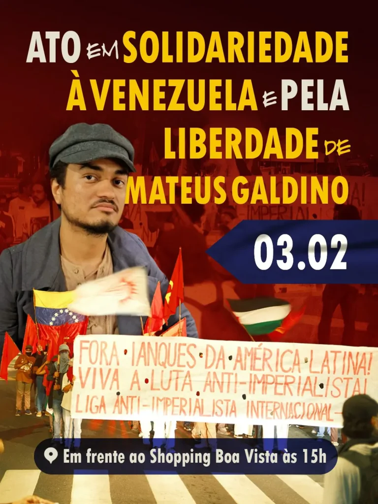 En Recife se ha llamado a la manifestación a todos los “activistas, demócratas y revolucionarios” contra la agresión en Venezuela pero también por la liberación del estudiante Mateus Galdino, preso político de la lucha anti-imperialista, y por la justicia de quienes fueron disparados por la Policía Militar en esa misma ciudad, tal y como informamos.