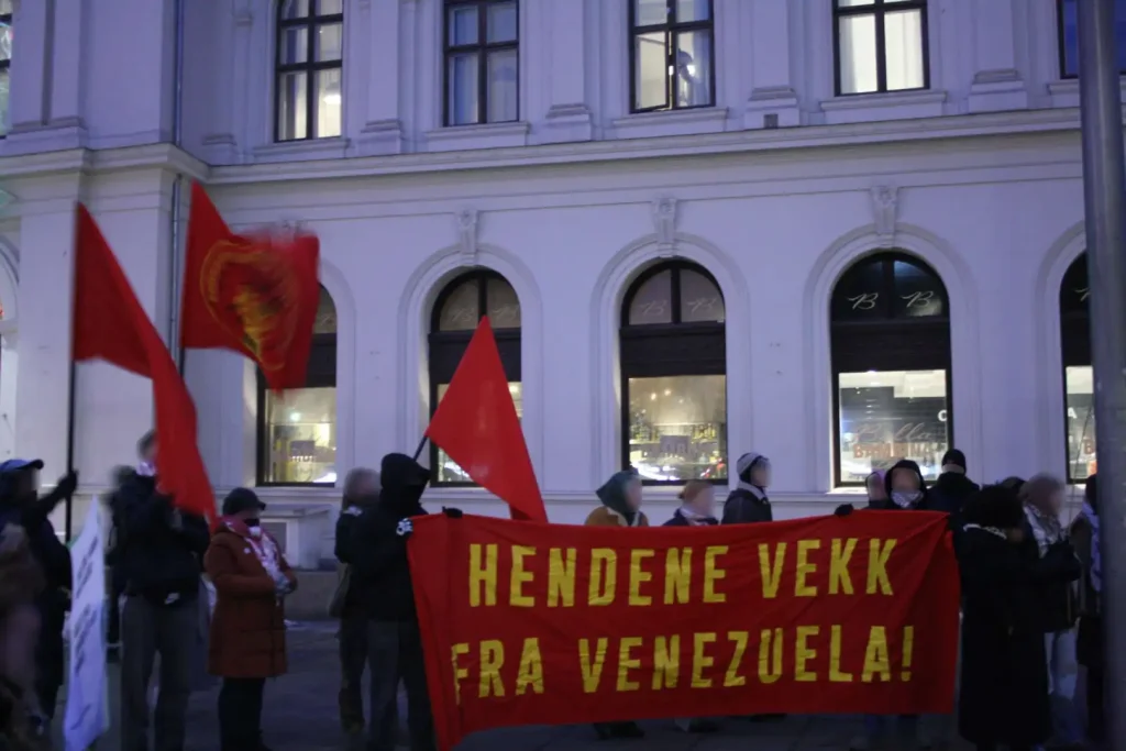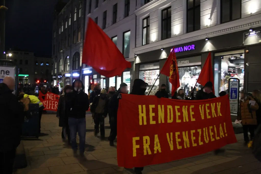 En Oslo, Noruega se convocó una manifestación contra las bases estadounidenses en Noruega y Kampkomiteen participó bajo el eslógan “¡Manos fuera de Venezuela!” Durante la marcha se gritaron consignas y se marchó hasta el Ministerio de Asuntos Externos.