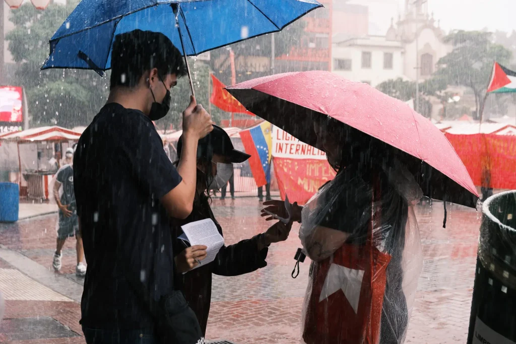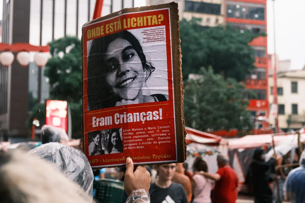 Los activistas extendieron tres telas del Comité Coordinador de la LAI con consignas antiimperialistas, elevando el carácter del acto internacionalista más allá del apoyo a Venezuela y extendiendo la solidaridad a otras luchas de liberación. También hubo carteles en homenaje al Camarada Basavaraj, Secretario General del PCI (Maoísta), y se levantó la campaña “¿Dónde está Lichita?”, exigiendo la aparición con vida de la niña Lichita, secuestrada por el ejército paraguayo. Los activistas llevaron un gran muñeco representando al imperialista Trump.