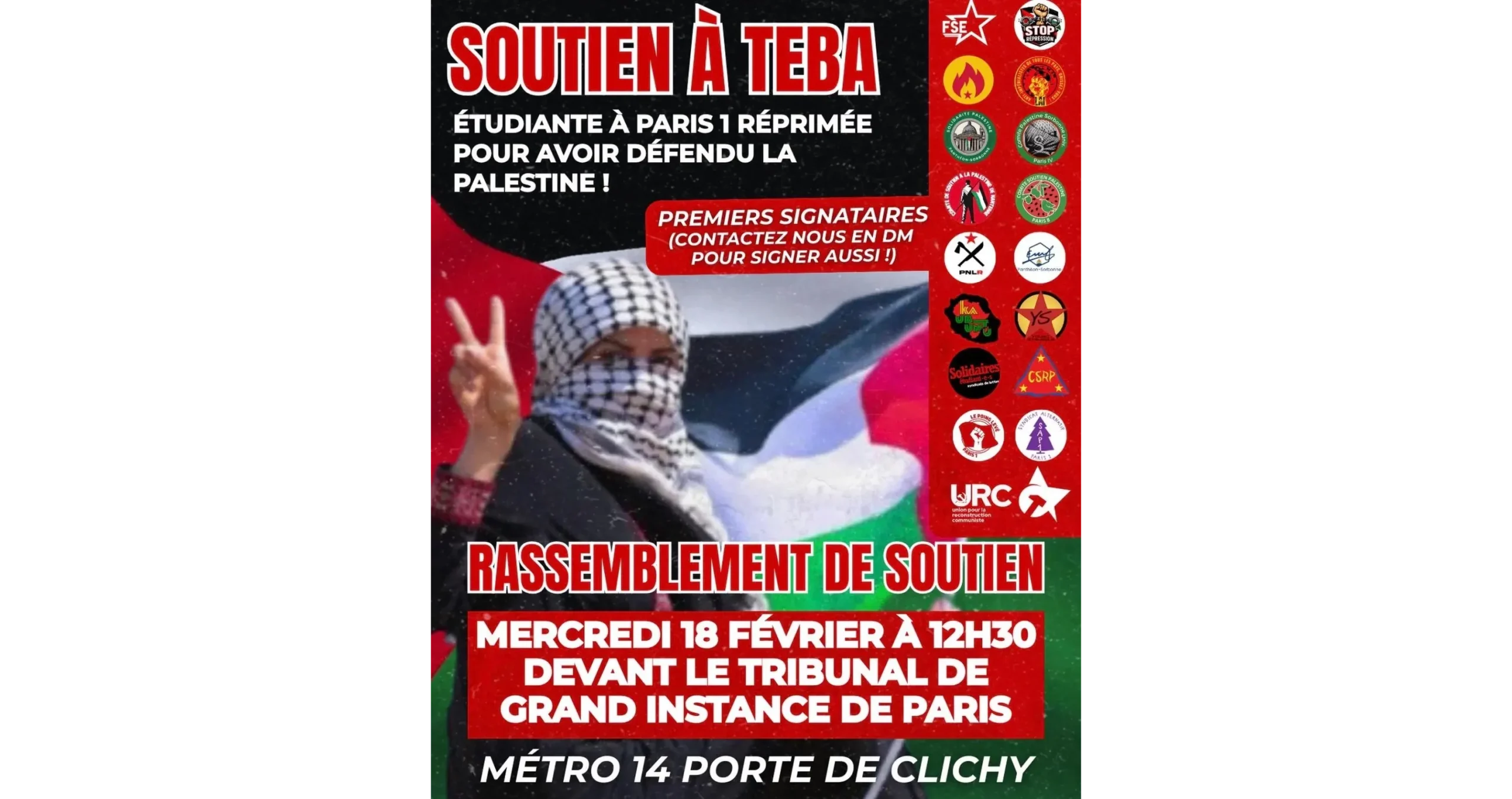 Teba, estudiante parisino, deberá comparecer ante el tribunal el miércoles 18 de febrero, a las 12:30 horas, por manifestar su solidaridad con Palestina.