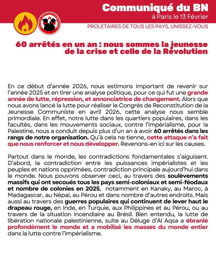 En este comienzo del año 2026, consideramos importante echar un vistazo sobre el año 2025 y hacer un análisis político de lo que fue un gran año de lucha, represión y anunciode cambios. Ahora que hemos iniciado la lucha para celebrar el Congreso de Reconstitución de la Juventud Comunista en abril de 2026, este análisis nos parece primordial. De hecho, nuestra lucha en los barrios populares, en las facultades, en los movimientos sociales, contra el imperialismo, por Palestina, nos ha llevado desde hace más de un año a tener 60 arrestados entre las filas de nuestra organización. No importa, este ataque solo nos ha fortalecido y hecho desarrollarnos. Volvamos aquí a las causas.