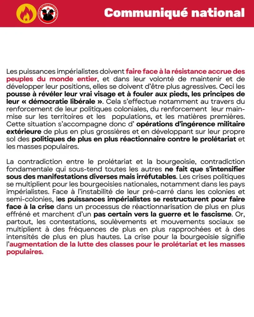 Las potencias imperialistas están enfrentándose a la creciente resistencia de los pueblos del mundo entero y, en su voluntad de mantener y desarrollar sus posiciones, se ven obligadas a ser más agresivas. Esto las empuja a revelar su verdadera cara y a pisotear los principios de su “democracia liberal”. Esto se lleva a cabo, en particular, mediante el refuerzo de sus políticas coloniales, el fortalecimiento de su control sobre los territorios y las poblaciones, y las materias primas. Esta situación va acompañada, por tanto, de operaciones de injerencia militar externa cada vez más burdas y del desarrollo en su propio territorio de políticas cada vez más reaccionarias contra el proletariado y las masas populares,