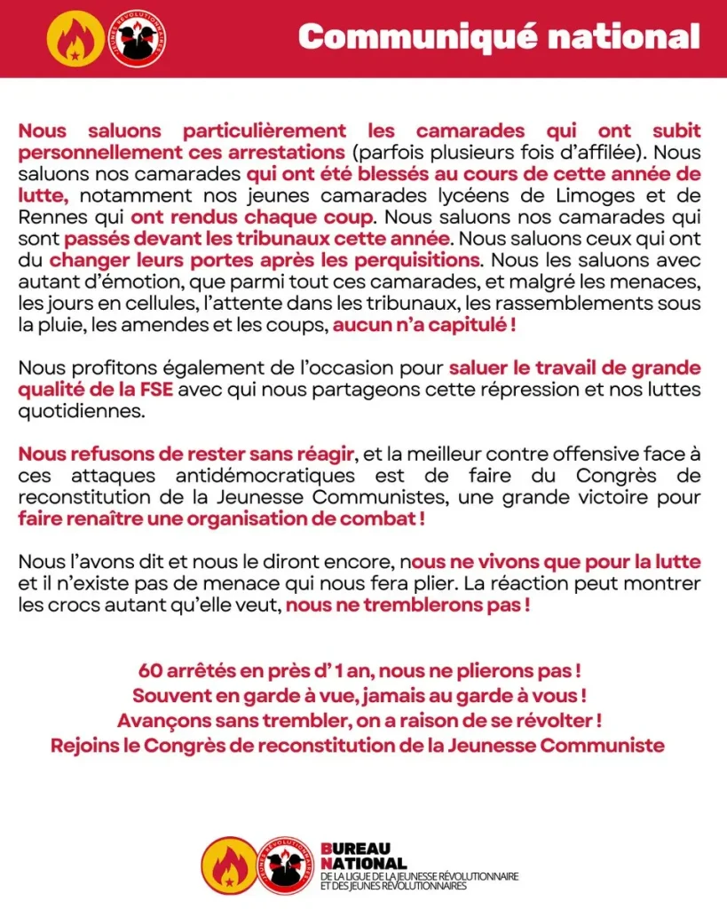 En casi un año, nuestra organización ha sufrido más de 60 arrestos, que van desde arrestos preventivos hasta juicios aún en curso, por motivos diversos y variados, pero en el fondo por una sola razón: ¡donde hay opresión hay resistencia y, desde el coronel Fabien, la Juventud Comunista nunca ha dejado de resistir!