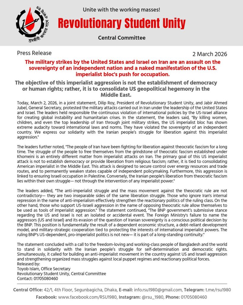 Hoy, 2 de marzo de 2026, en una declaración conjunta, el presidente de Unidad Estudiantil Revolucionaria, Dilip Roy, y Jabir Ahmed Jubel, Secretario General, protestaron contra los ataques militares llevados a cabo en Irán bajo la dirección de Estados Unidos e Israel. Los dirigentes hicieron responsables de la continua violación a las políticas internacionales por parte de la alianza Estados Unidos-Israel por crear una inestabilidad mundial y crisis humanitarias. En la declaración, los dirigentes dijeron, “Al asesinar mujeres, niños e incluso a los máximos dirigentes de Irán mediante ataques militares conjuntos, el bloque imperialista estadounidense ha mostrado un desprecio extremo hacia las normas y leyes internacionales. Han violado la soberanía de un país independiente. Expresamos nuestra solidaridad con la lucha del pueblo iraní por su liberación contra esta agresión imperialista”.