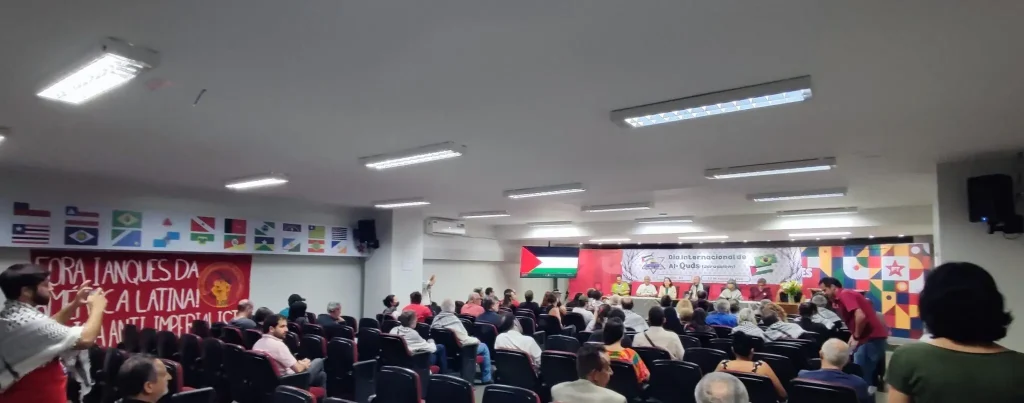 Un acto político y cultural en conmemoración del Día Internacional de Al-Quds reunió a organizaciones populares, representantes diplomáticos, partidos políticos y medios de comunicación democráticos en Brasília la noche del viernes 13 de marzo. El evento expresó solidaridad con la lucha del pueblo palestino y denunció la ocupación israelí de Palestina y las políticas imperialistas de Estados Unidos en Oriente Medio.