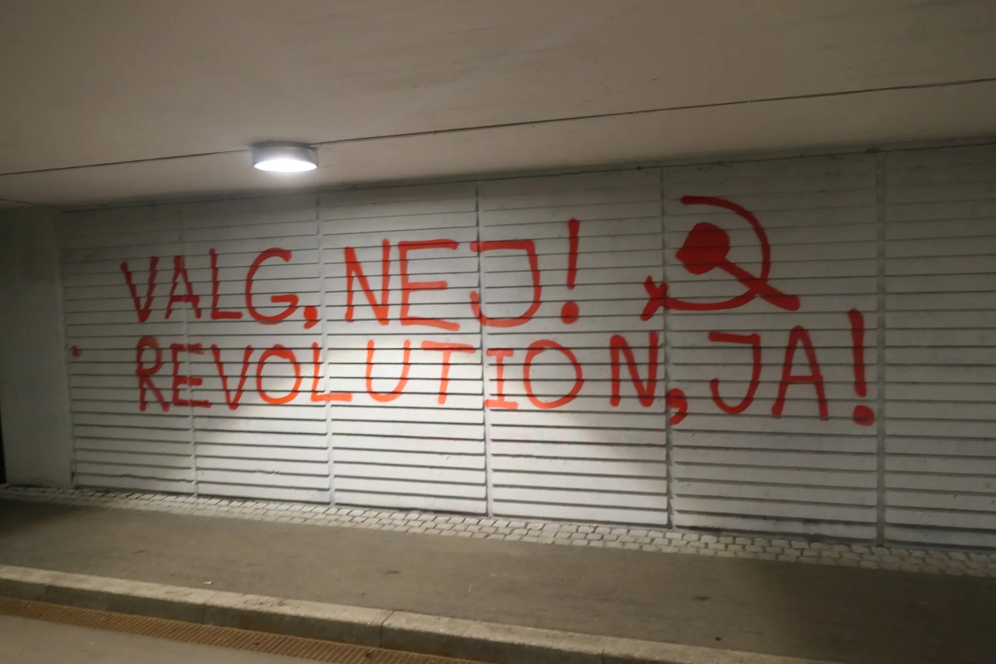 La pinta de la izquierda dice “El único voto contra el sistema: ¡Boicotear las elecciones!”. La pinta de la derecha dice: “¡Elecciones no, Revolución sí!”Una pinta dice “¡Boicotear las elecciones!” y una pegatina que dice “El único voto contra el sistema: ¡Boicotear las elecciones!” en Aalborg