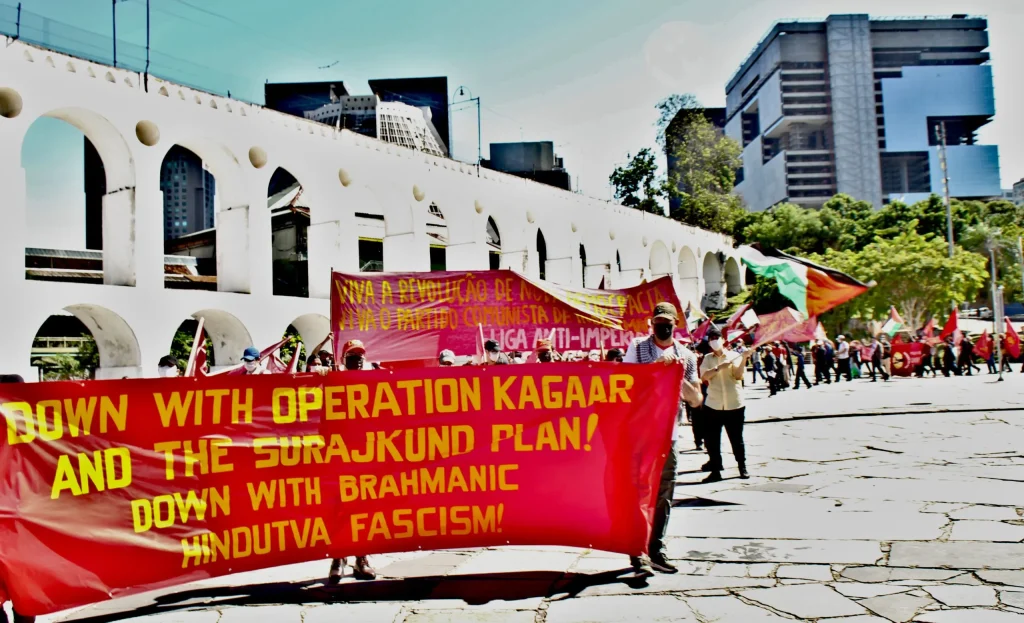 El 28 de Marzo, como parte del día de movilización para la Conferencia Nacional de la Liga Antimperialista Internacional en Brasil, una manifestación contra «Operación Kagaar» y el gobierno fascista de Narendra Modi recorrió las calles de Río de Janeiro con más de cien participantes. La pancarta de la manifestación decía: «¡Abajo la Operación Kagaar y el Plan Surjakund! ¡Abajo el fascismo hinduista brahmánico!», informa A Nova Democracia (AND).