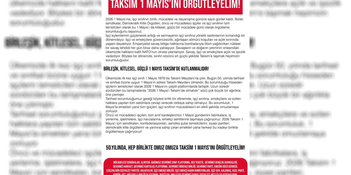 Hacemos un llamado a los obreros pioneros y combativos, a todos nuestros hermanos y hermanas de clase, para que lleven la agenda del Primero de Mayo a las fábricas, los centros de trabajo, las empresas, las zonas industriales y los barrios obreros. Para el Primero de Mayo de Taksim de 2026, hacemos un llamado a los sindicatos, las confederaciones, los representantes sindicales, los Partidos políticos, las organizaciones democráticas de masas y a todos aquellos que defienden a los obreros y se responsabilizan del futuro para organizar esta voluntad.