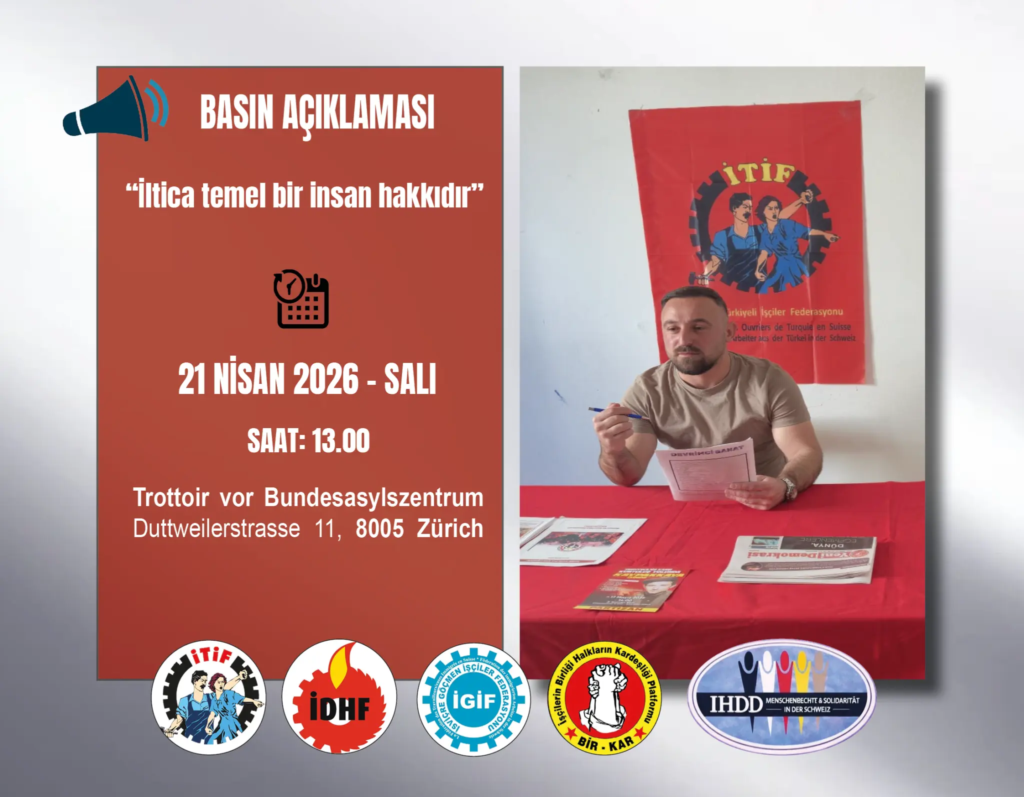 Se ha convocado una rueda de prensa conjunta en solidaridad con Cemal Toydemir, miembro de la junta directiva de la Federación de Obreros Turcos en Suiza (ITIF) y refugiado político procedente de Turquía.