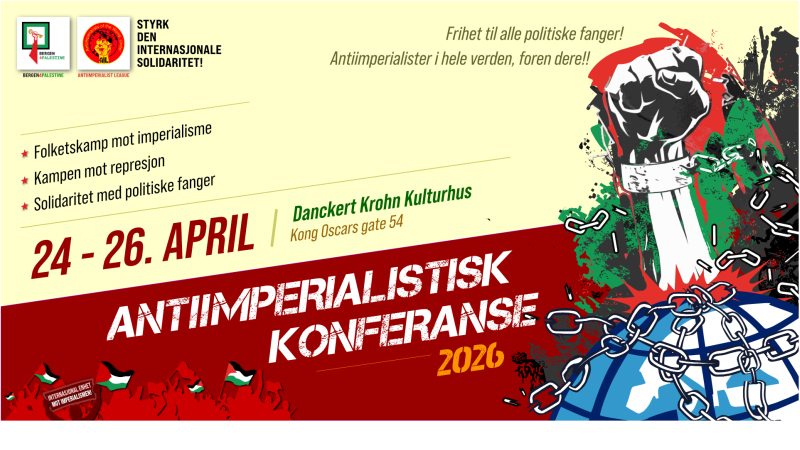 Kampkomiteen insta encarecidamente a todos los antiimperialistas a que asistan a la Conferencia Antiimperialista de 2026 en Bergen (Noruega), organizada por nuestros compañeros de Bergen4Palestine. La conferencia se celebró por primera vez en 2024 con el objetivo de reforzar la solidaridad entre las fuerzas antiimperialistas a nivel local, regional e internacional.